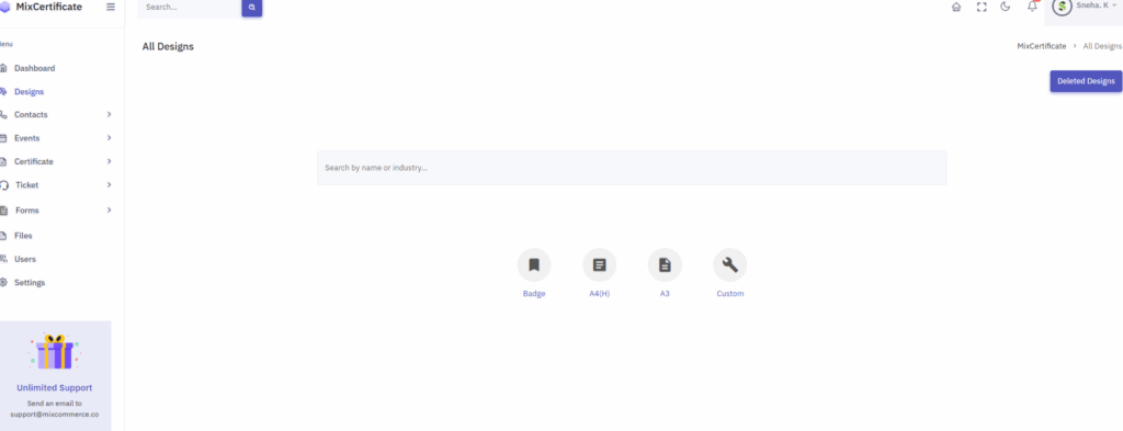 New certificates can be created under “All Designs” in formats like Badges, A4(H), and A3, with options to save, preview, download & create.